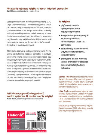 Z tą książką opanujesz podstawy generatywnej AI i nauczysz się skutecznie stosować jej modele w praktyce. Szczególną uwagę poświęcono integracji modeli językowych i dyfuzyjnych, co często bywa wyzwaniem, zwłaszcza w zakresie stabilności uzyskanych rozwiązań. Autorzy w jasny sposób wyjaśniają, jak za sprawą inżynierii promptów zapewnić niezawodność działania sztucznej inteligencji w środowiskach produkcyjnych. Co więcej, zaproponowane zasady są skonstruowane tak, aby bez trudu przetrwały próbę czasu i mogły być używane również dla przyszłych modeli!