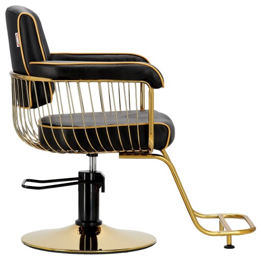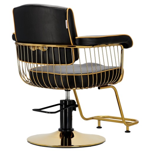 Fotel charakteryzuje się eleganckim i ergonomicznym designem, który pozwala na wygodną pracę fryzjera oraz relaks klientów.