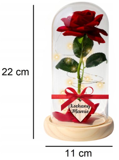Róża wykonana została z najwyższej jakości materiałów, co sprawia, że na długo zachowa swój urok. Umieszczona w szklanym kloszu, ozdobiona ciepłym światłem i delikatnym sercem z napisem "Kochanej Mamie", będzie piękną dekoracją i symbolem Twojej miłości każdego dnia.