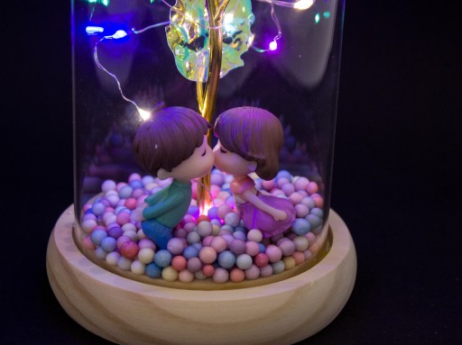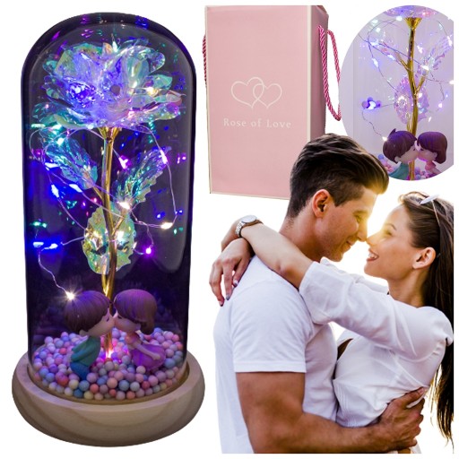 Kolorowa opalizująca przezroczysta sztuczna róża, mieniąca się kolorami z figurkami całującej się pary i kolorowymi kuleczkami w kopule szklanej, z kolorowym oświetleniem LED.