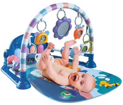 ➡️ Mata ma przymocowany pałąk z kolorowymi zabawkami-grzechotkami, leżąc dziecko może stópkami grać na pianinie.