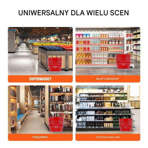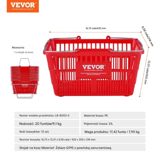 - 12 czerwonych koszyków na zakupy o pojemności 21 litrów
