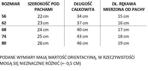 Rozmiary: Dla dzieci w wieku od 0 do 24 miesięcy (możliwość uszycia na miarę).