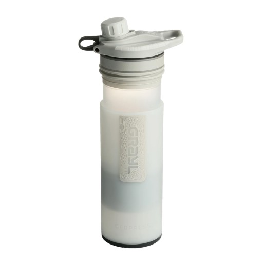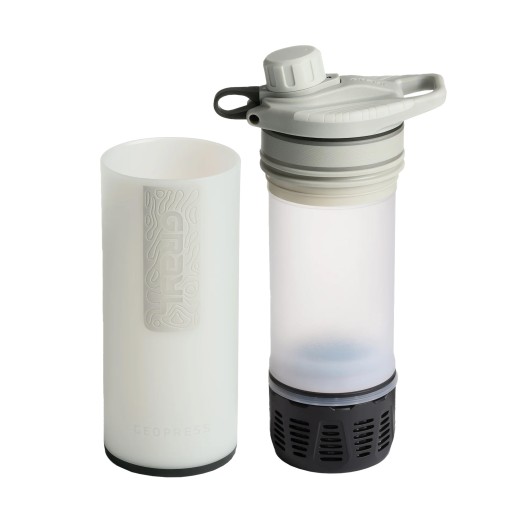 Grayl GeoPress składa się z czterech elementów: wytrzymałego pojemnika zewnętrznego, filtra węglowego, pojemnika na czystą wodę oraz pokrywki z ustnikiem do picia i odpowietrzania. Aby ułatwić proces wciskania filtra, boki pokrywy są szersze i pokryte antypoślizgową gumą. Pojemnik pomieści 710 ml wody, a wydajność filtra wynosi 250 litów lub 3 lata od pierwszego użycia.