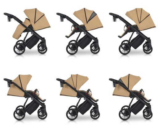 - Możliwość wpięcia gondoli, spacerówki, oraz fotelika samochodowego (elementy można wpinać przodem i tyłem do kierunku jazdy)