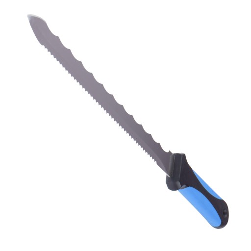⬅️Profesjonalny nóż do cięcia wełny mineralnej i izolacji o długości całkowitej 42 cm. Wyposażony w ząbkowane ostrze ze stali nierdzewnej oraz ergonomiczny uchwyt z tworzywa sztucznego. Idealne narzędzie do precyzyjnego cięcia materiałów izolacyjnych.
