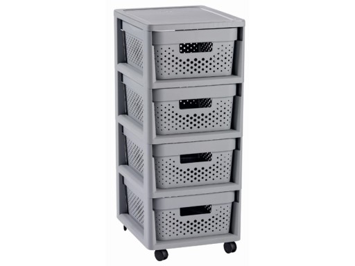 Prosty sposób na uporządkowanie domowych akcesoriów, niech wszystkie drobiazgi wreszcie znajdą swoje stałe miejsce! Regał wyposażony jest w cztery pojemne szuflady z wygodnymi uchwytami. Dzięki prostej, skandynawskiej stylistyce regał znajdzie swoje miejsce w łazience, sypialni, salonie, czy garderobie. Wygodę użytkowania zapewniają też kółka, pozwalając na proste przemieszczanie mebla, oraz łatwe do czyszczenia gładkie wykończenie. Produkt wykonany został z tworzywa sztucznego, dzięki czemu jest trwały i łatwy w utrzymaniu czystości, a także lekki i poręczny.