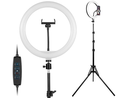 Lampa pierścieniowa 12" charakteryzuje się wewnętrzną średnicą 24 cm (30 cm zewnętrzna) oraz 160 diodami LED, równomiernie rozmieszczonymi w obudowie pierścienia oświetlającego. Lampa posiada regulację natężenia oświetlenia w zakresie 900-1700 lm oraz regulację temperatury barwowej (3 tryby) w zakresie od 2700 do 7000 K.