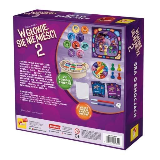 Wejdź do kolorowego świata emocji i baw się, rozwiązując quizy oraz podejmując wyzwania! Inside Out 2 Emocjonalna Przygoda to interaktywna gra planszowa, która zabierze cię w emocjonalną podróż pełną zagadek i zadań, pomagając lepiej zrozumieć uczucia. Gra przeznaczona jest dla 2 do 4 graczy, a każda rozgrywka dostarcza mnóstwo quizów i wyzwań, które rozwijają umiejętności poznawania emocji. Dzięki wyjątkowej planszy i 3D konsolom, gracze wcielają się w rolę emocji i wspólnie odkrywają, jak różne uczucia wpływają na życie.W zestawie między innymi:plansze,wskaźnik emocji - spinner,4 karty miejsc,4 trójwymiarowe konsole,25 kart emocji36 żetonów emocji.
