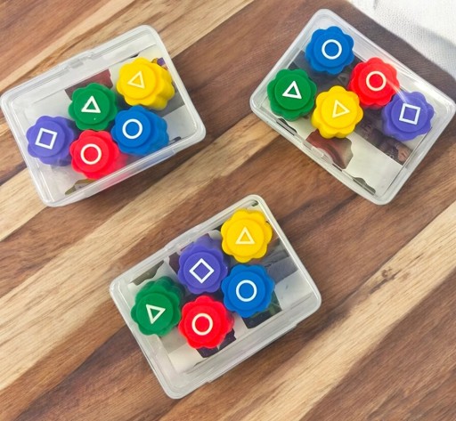 ➡️Komplet 5 kolorowych kości z symbolami inspirowanymi popularnym serialem Squid Game, które dodają grze odpowiedniego klimatu.