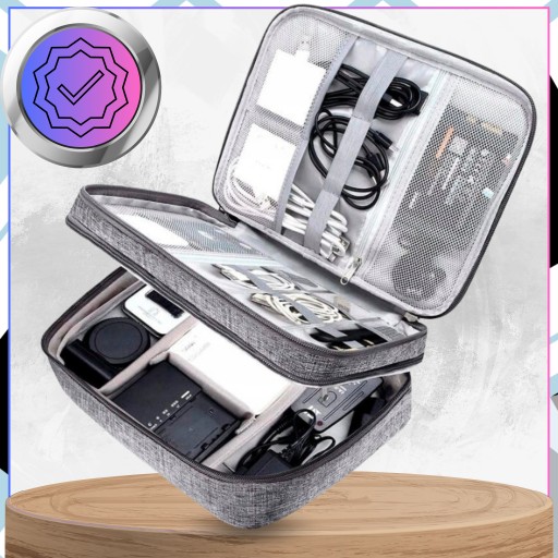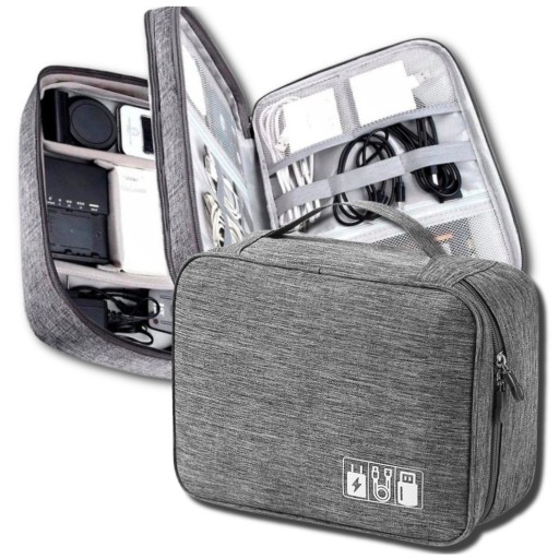 Posiada wymiary 24x18,5x10 cm, co czyni go kompaktowym, a jednocześnie wystarczająco pojemnym, aby zmieścić najważniejsze akcesoria. Dzięki licznym przegródkom i kieszeniom – w tym pięciu małym kieszeniom z siatki, pięciu przegrodom na krótkie kable i czterem dużym przegrodom – każdy przedmiot znajdzie swoje miejsce. Porządek w przewodach i ładowarkach nigdy nie był tak prosty!