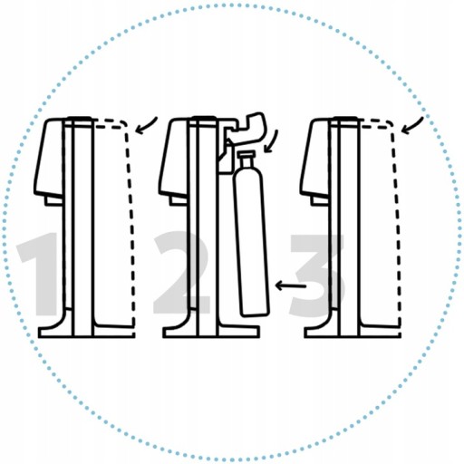 - Włóż cylinder do saturatora, tak aby różowy ring na butli był zaczepiony o dźwignię. Pociągnij dźwignię w dół aby zabezpieczyć cylinder.
