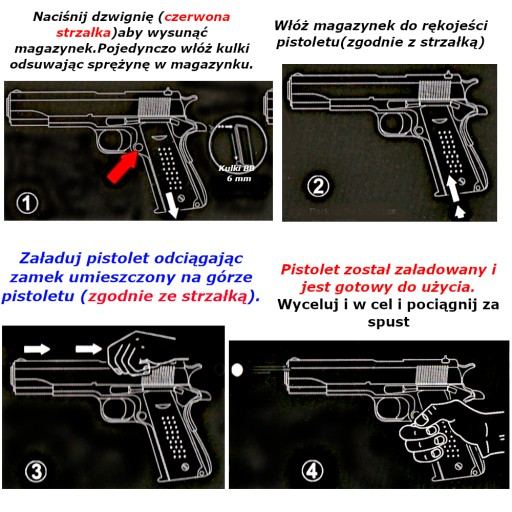 PAMIĘTAJ o zasadzie – jedno przeładowanie jeden strzał. Kilkukrotne przeładowanie pistoletu bez oddania strzału powoduje załadowanie kilku kulek do komory co może spowodować uszkodzenie repliki.