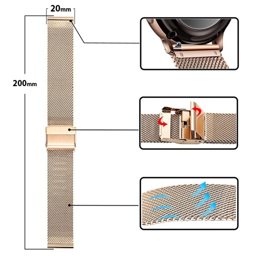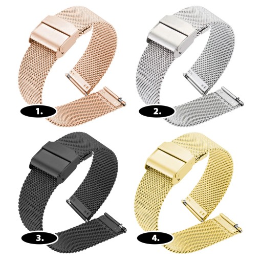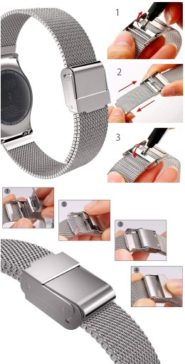 Wysokiej jakości, bransoleta ze stali nierdzewnej o szerokości 20mm. Ma wzór plecionej siatki i podwójne zapięcie na klamrę, co nadaje zegarkom nowoczesny, stylowy wygląd, a podwójne zapięcie zapewnia bezpieczeństwo, że zegarek nie zsunie się nam z ręki.