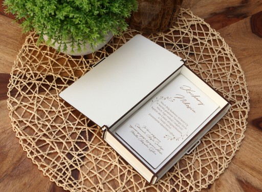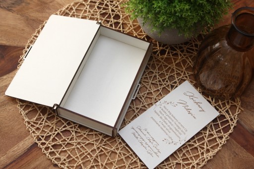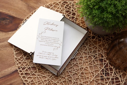Wewnątrz pudełka znajduję się spersonalizowana kartka z białego HDF z wygrawerowanymi życzeniami oraz podpisem która sprawia, że upominek jest jeszcze bardziej wyjątkowy