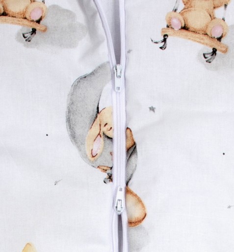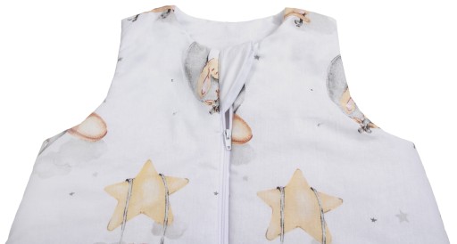 - Śpiworek wyposażony jest w suwak, zakończony osłonką na podbródek dziecka.