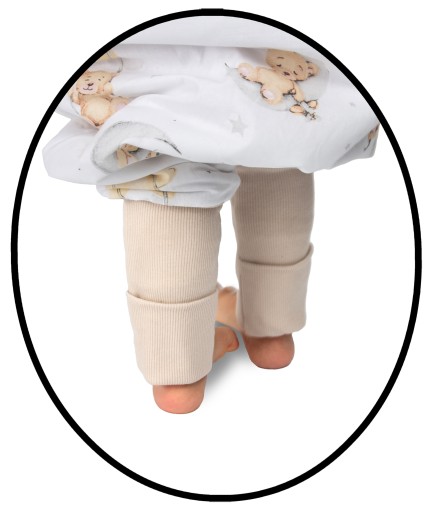 Przedłużane, wywijane nogawki zastępują skarpetki, ogrzewają stopki maluszka.