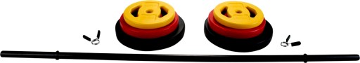 ⭐Obciążenia: 2 x 5 kg (czarne), 21 x 2,5 kg (czerwone), 2 x 1,25 kg (żółte)