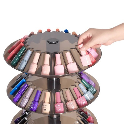 Praktyczny stojak obrotowy umożliwiający wygodne przechowywanie i prezentację lakierów hybrydowych, klasycznych oraz akcesoriów kosmetycznych. Idealny do salonów kosmetycznych i domowego użytku.
