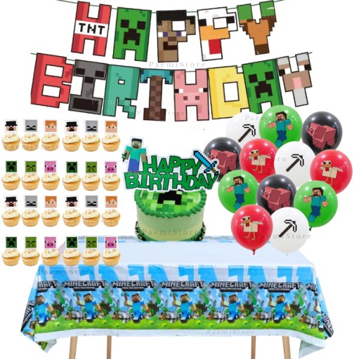 Zestaw zawiera: 1 szt. girlanda "Happy Birthday", 1 szt. topper na tort, 1 szt. obrus na stół, 24 szt. topperów oraz 12 szt. balony lateksowe Minecraft.