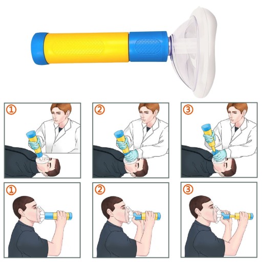 Pociągnij uchwyt i tłok, jednocześnie mocując maskę do twarzy ofiary. Jeśli przeszkoda nie zostanie usunięta przy pierwszym pociągnięciu, kontynuuj popychanie i ciągnięcie uchwytu i tłoka bez zdejmowania maski z twarzy ofiary, aż przeszkoda zostanie usunięta