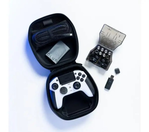 - Wyposażenie: futerał/pokrowiec, instrukcja obsługi, kabel USB, wymienne moduły, nadajnik USB, nakładki na analogi