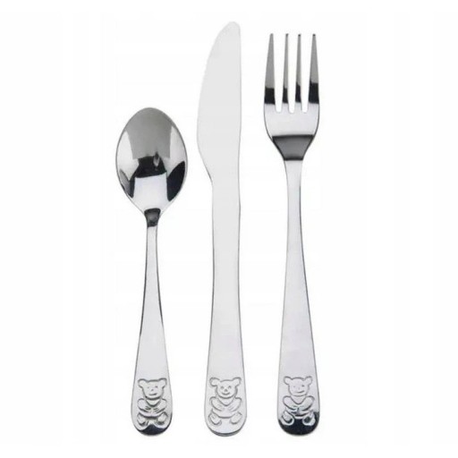• Komplet sztućców – 3 sztuki (łyżeczka, widelec, nóż) wykonane ze stali nierdzewnej z grawerem misia