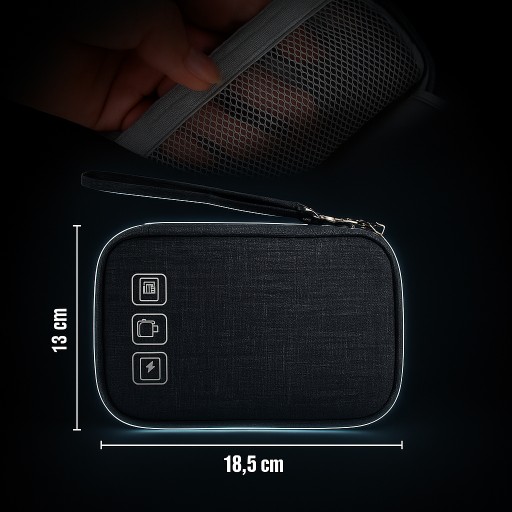 - idealny do organizacji akcesoriów elektronicznych w plecaku czy torbie.