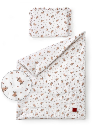 ➡️ Komplet pościeli uszyty z najwyższej jakości muślinu bawełnianego double gaze. Składa się z poduszki w rozmiarze 40x50cm obszytej dekoracyjną falbanką oraz kołderki 120x90cm.