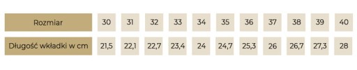Przy wyborze rozmiaru obuwia prosimy sugerować się długością wkładki. Wszystkie długości wkładek zostały zamieszczone w tabeli poniżej.