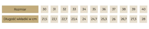 Przy wyborze rozmiaru obuwia prosimy sugerować się długością wkładki. Wszystkie długości wkładek zostały zamieszczone w tabeli poniżej.