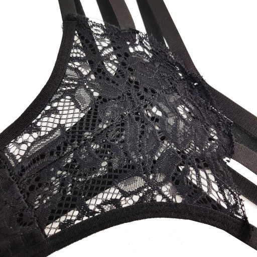 Czarne stringi wykonane z przyjemnej w dotyku koronki. Co je wyróżnia? - Potrójne, elastyczne czarne paski na biodrach.