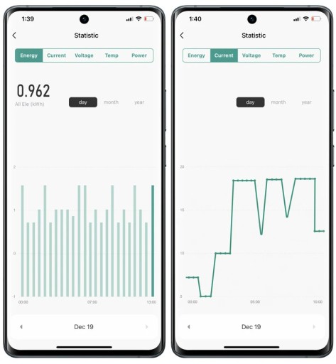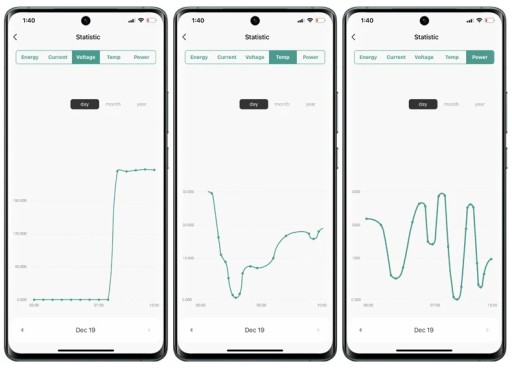 - osobne statystyki dla energii, prądu, napięcia, temperatury, mocy