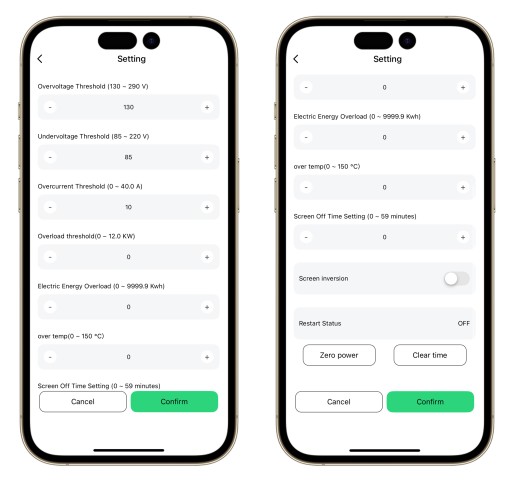 - Zabezpieczenie przeciążeniowe [W] - zakres 1-12kW - odłączenie zasilania po wzroście mocy powyżej zadanej wartości