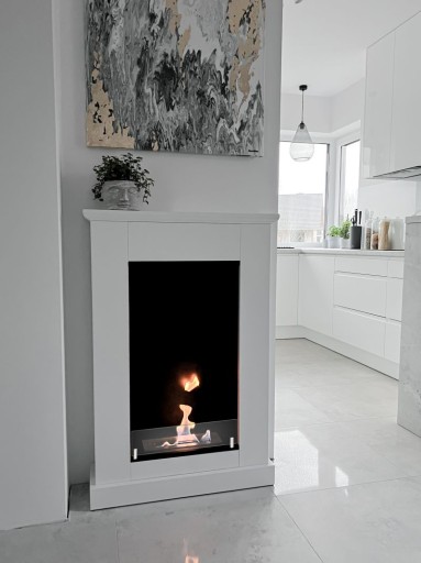 Biokominek wykonany z wysokiej jakości MDFu lakierowanego farbą termoodporną w kolorze biały mat oraz szwedzkiej stali lakierowanej proszkowo farbą termoodporną w kolorze czarny mat strukturalny. Zadbano o każdy detal wykonania, a także o bezpieczeństwo użytkowania.