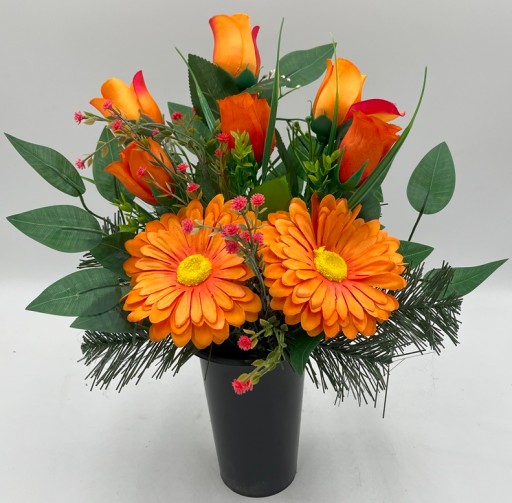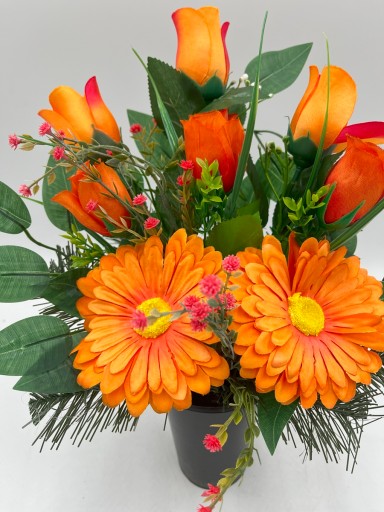 W skład kompletu wchodzą 2 dekoracje: 1szt bukiet do wazonu z wkładem oraz 1szt dekoracja nagrobna na płytę w misie