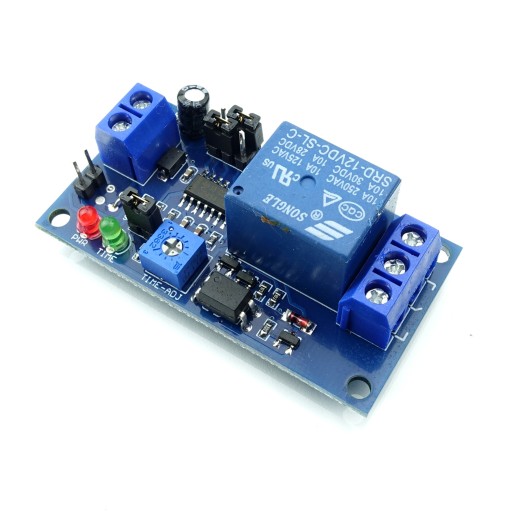 Moduł przekaźnika timerem zasilany napięciem 12V. Posiada regulacje ustawiania czasu działania potencjometrem, który można regulować w zakresie 0.1S do 61 minut. Na płytce znajdują się dwie diody sygnalizujące prace modułu.