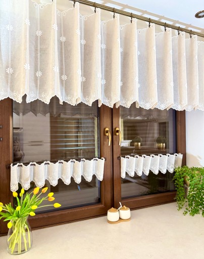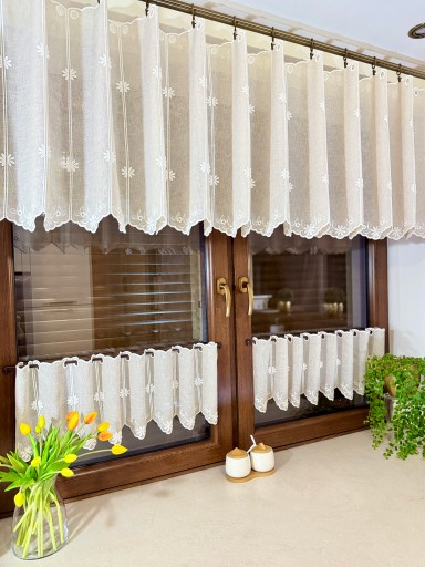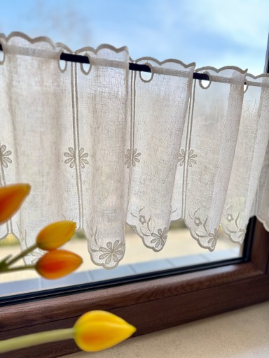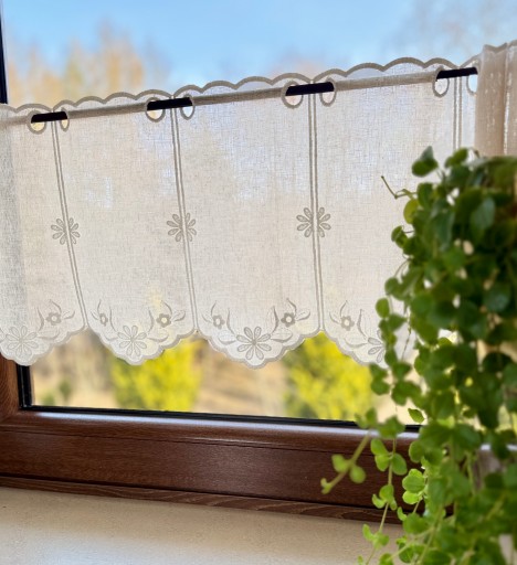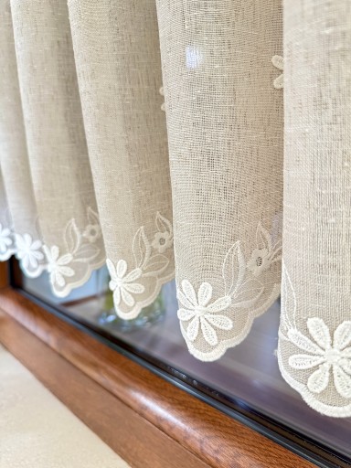 Przedmiotem sprzedaży jest firaneczka typu zazdrostka w kolorze Beżowym przyozdobiona haftem z motywami kwiatuszków.