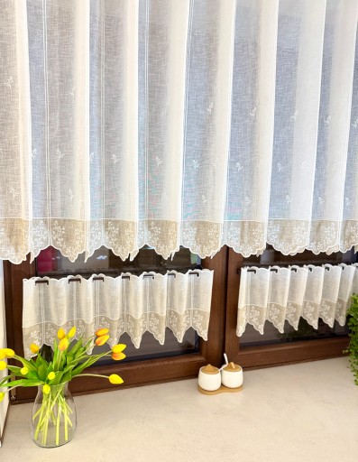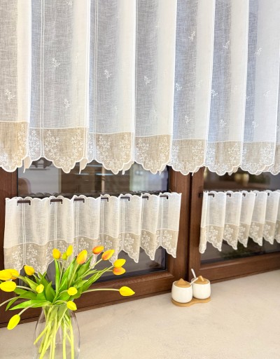 Przedmiotem sprzedaży jest firaneczka typu zazdrostka w kolorze Ecrii wykończona u dołu beżową wstawką przyozdobioną delikatnym haftem drobniutkich kwiatuszków.