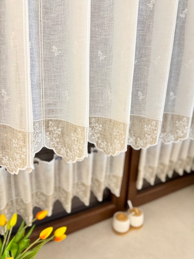 Ze względu że ozdobna beżowa tkanina jest naszywana na przód to lewa strona firaneczki jest ecrii