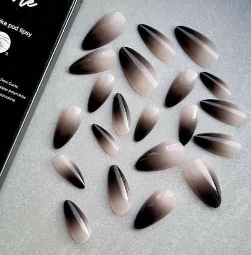 ✔️ Gotowe tipsy, paznokcie almond. Naklejane sztuczne paznokcie zdobione w kształcie migdała. Paznokcie wyróżniają się ciekawym zdobieniem z czarną końcówką oraz jasnoróżowym początkiem.
