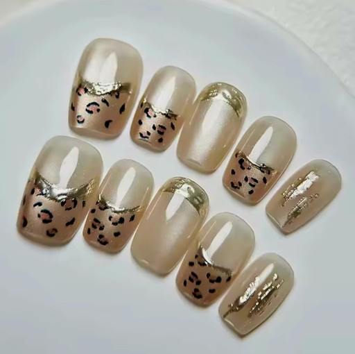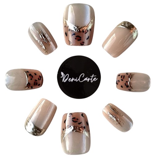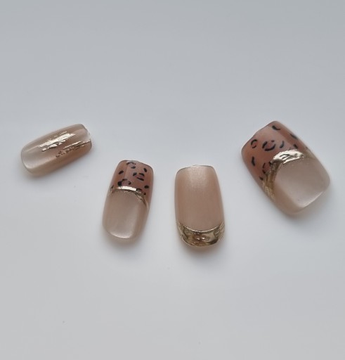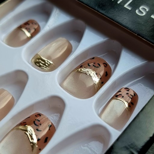 Paznokcie Sztuczne Tipsy Nude Perłowe Pearl Animal French Panterka Gold