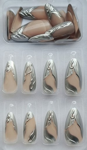 ✔️ Gotowe tipsy, paznokcie almond. Naklejane sztuczne paznokcie zdobione w kształcie migdała. Paznokcie wyróżniają się neutralnym kolorem bazowym oraz srebrnym, wypukłym zdobieniem.