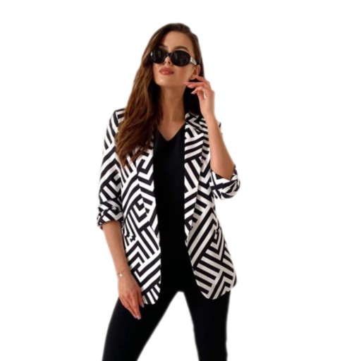 Marynarka w czarno - biały zygzak, rękawy podwijane, taliowany krój.
