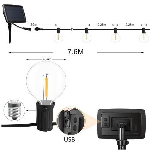 - 【Bez Gniazdek, Bez Rachunków, Dowolne Umiejscowienie】Całkowita długość girlandy wynosi 7,6 m i zawiera 25 wodoodpornych żarówek LED do użytku zewnętrznego oraz 2 zapasowe. Odległość od panelu słonecznego do pierwszej żarówki to 1,39 m – możesz umieścić lampki ogrodowe tam, gdzie chcesz;