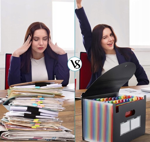 Oszczędza czas - 24 kolorowe kieszenie z górnymi zakładkami tworzą niezależne miejsca na dokumenty. Można użyć dostarczonych kolorowych etykiet do sortowania dokumentów według kategorii, co skraca czas wyszukiwania dokumentów.