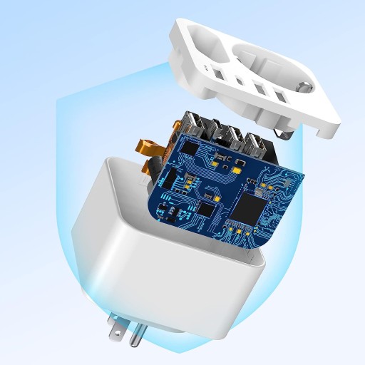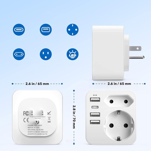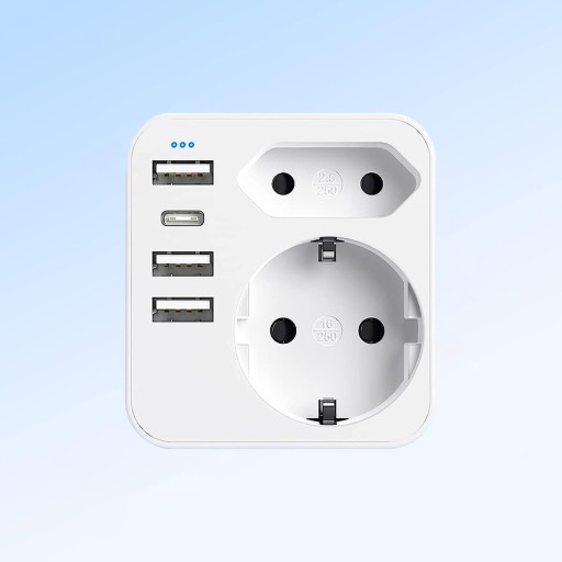 {Type B 6-in-1 Travel Adapter} - 1 gniazdo zasilania (2-pin EuropeanSchuko) 1 niemieckie gniazdo zasilania 1 port szybkiego ładowania typu C (3 A/MAX17 W) 3 porty USB (3,4 A), 3 porty USB (5 V/3,4 A),