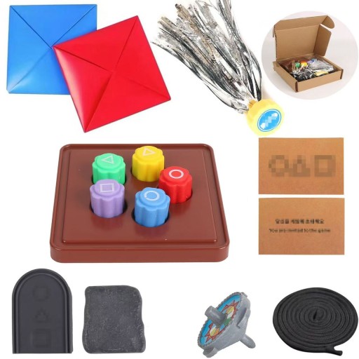 ✅ Komplet 5 kolorowych kości z symbolami inspirowanymi popularnym serialem Squid Game, które dodają grze odpowiedniego klimatu.