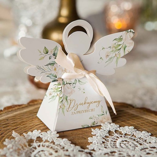 PUDEŁECZKA podziękowanie Aniołek Białe Kwiaty 10szt (+wstążki)