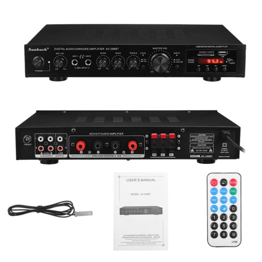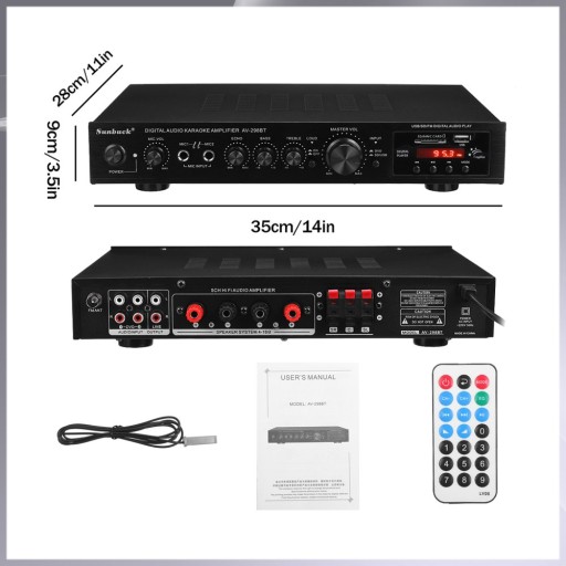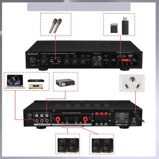 - Przeciągnij pliki MP3 z komputera do pamięci USB i podłącz do wzmacniacza w celu natychmiastowego odtwarzania, korektor i tuner FM, bezpośrednie podłączanie telewizorów, odtwarzaczy CD i komputerów/laptopów, podświetlany na czerwono panel przedni LED, gniazdo 3,5 mm z przodu dla odtwarzacza audio.